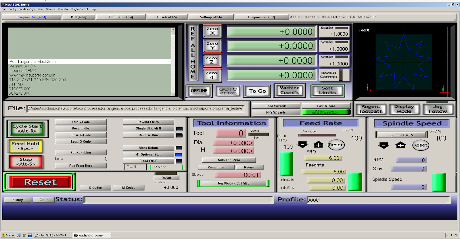 O programa G-Code pode ser carregado diretamente no Mach3 e executado diretamente sem complicações, conforme exemplo abaixo.